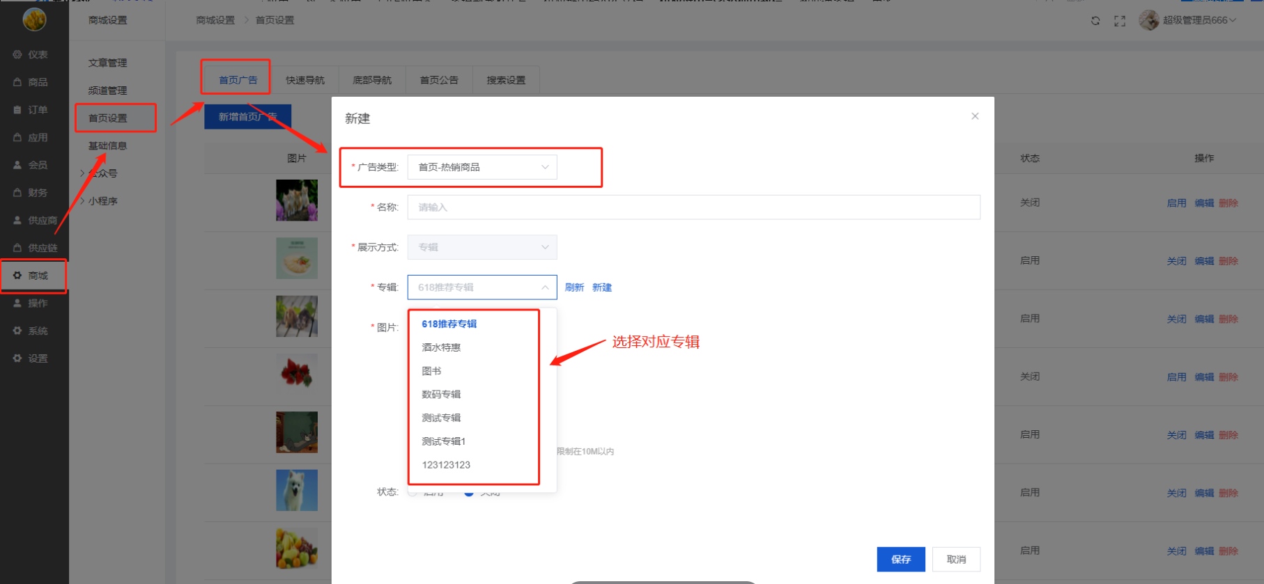 【专辑】专辑本质是商品的集合,广告跳转就会跳到专辑页面。选择专辑后,广告跳转到专辑页面。注:专辑前往商品-商品专辑进行设置。